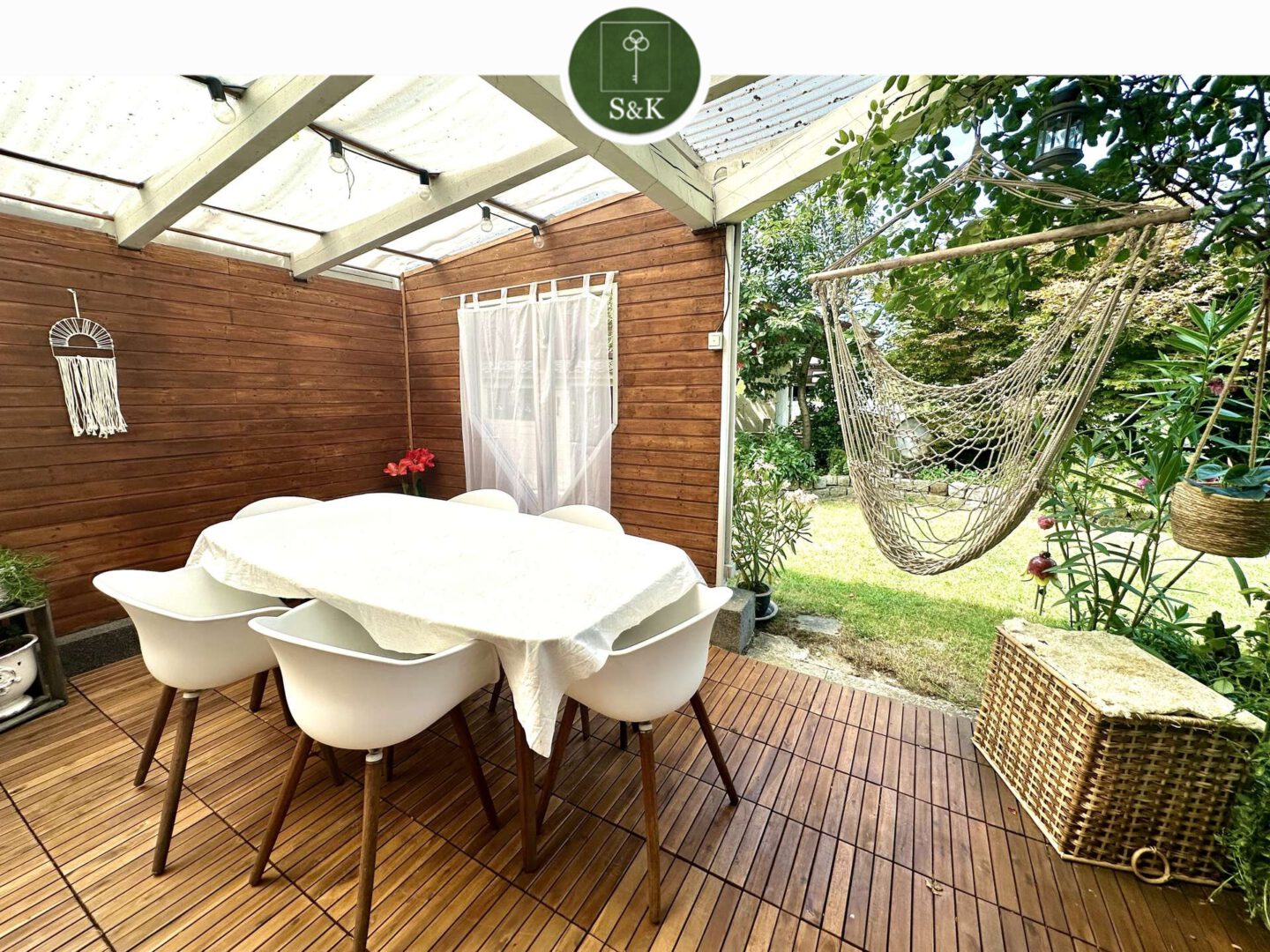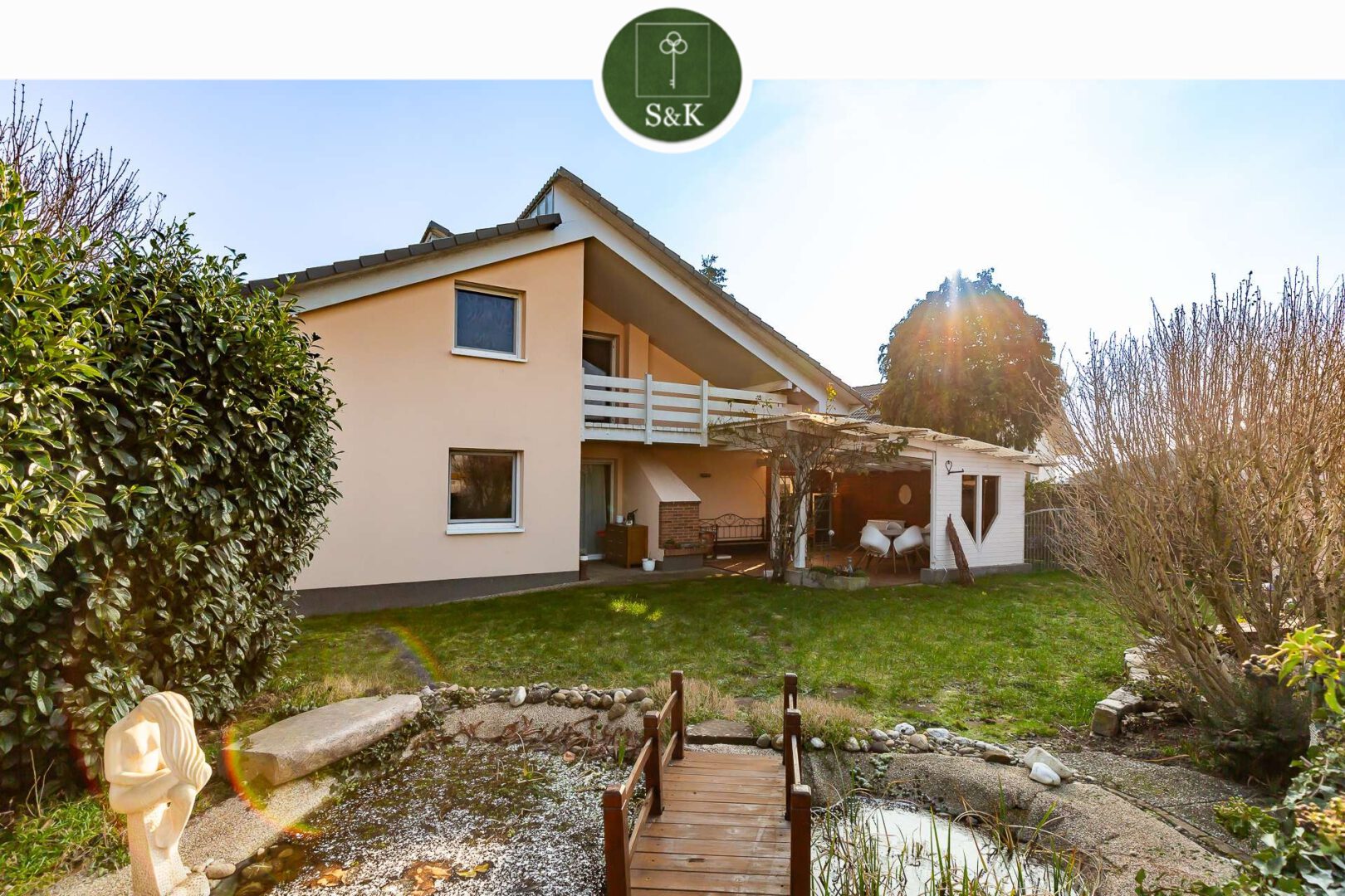 Der Außenbereich lädt ebenfalls zum Verweilen ein: Die überdachte Terrasse mit einem gemauerten Grill bietet den idealen Rahmen für gesellige Abende, während der liebevoll angelegte Garten mit Brunnen und Gartenteich ein kleines Paradies zum Entspannen ist. Eine Einzelgarage mit Grube sowie zwei weitere Stellplätze sorgen für optimale Parkmöglichkeiten.
