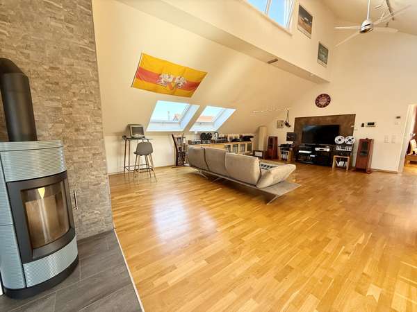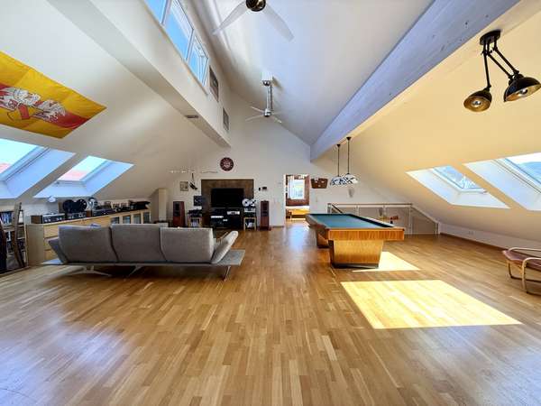 Im Ober- und Dachgeschoss befindet sich ein hochwertig ausgestatteter Wohnbereich mit rund 210 m², der gleichermaßen als Unternehmenswohnung, repräsentative Geschäftsleitungsetage oder attraktive Mietwohnung genutzt werden kann. Offene Räume, hohe Decken und großzügige Fensterflächen schaffen ein helles, modernes Ambiente. Balkone und Terrassen eröffnen den Blick in den weitläufigen Garten hinter dem Haus – ein idealer Rückzugsort nach einem produktiven Arbeitstag.